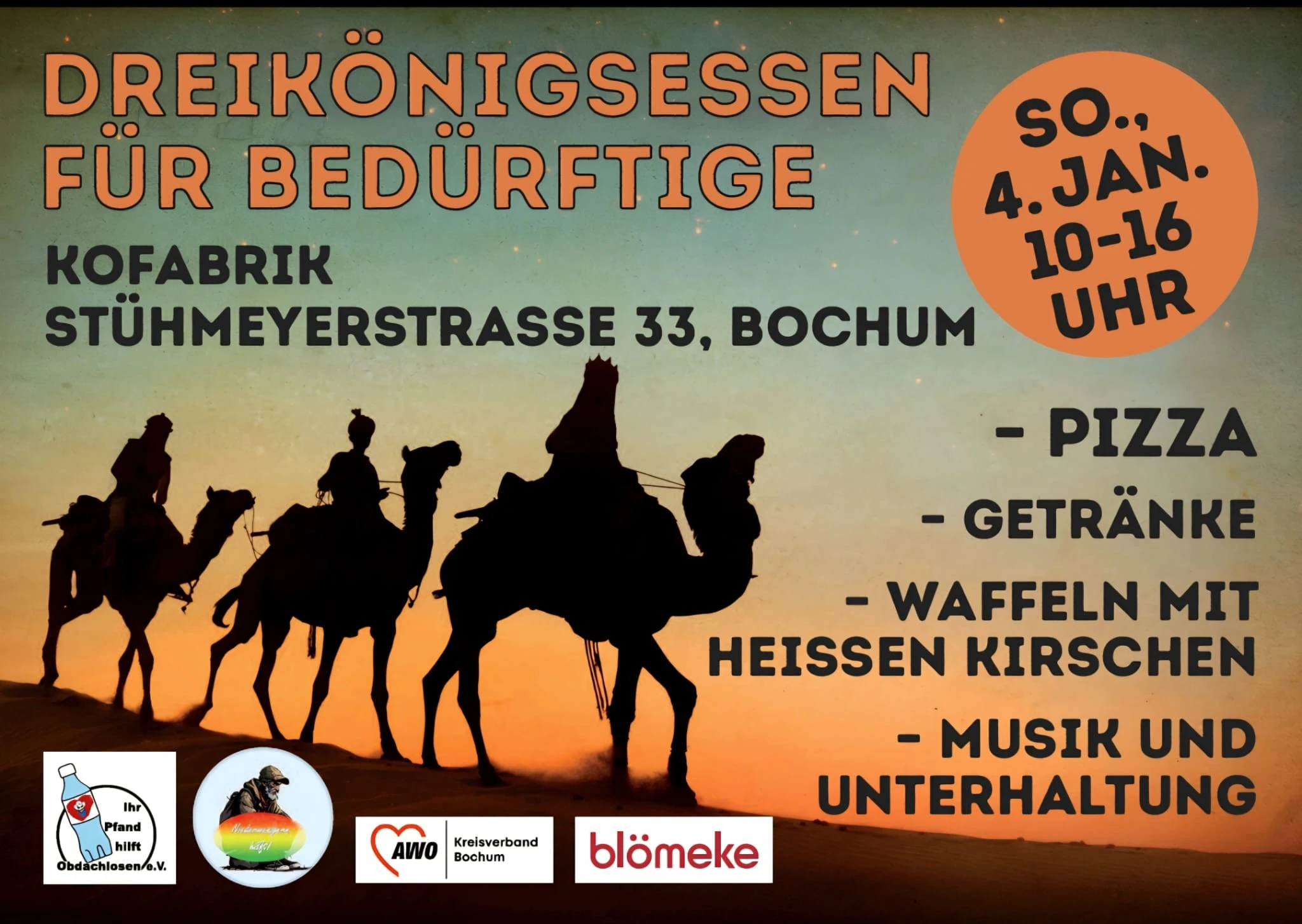 Auf Initiative des Vereins „Ihr Pfand hilft Wohnungslosen e.V.“ findet kurz vor dem Dreikönigstag eine Benefizveranstaltung für bedürftige Menschen statt. Gemeinsam mit weiteren Akteuren werden Pizza & Getränke angeboten. Der AWO-Kreisverband Bochum sorgt für frische Waffeln und Gebäck. Den musikalischen Rahmen setzt das Italo-Duo Domenico deAngel und Andrea TiAmo.